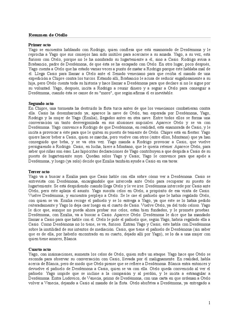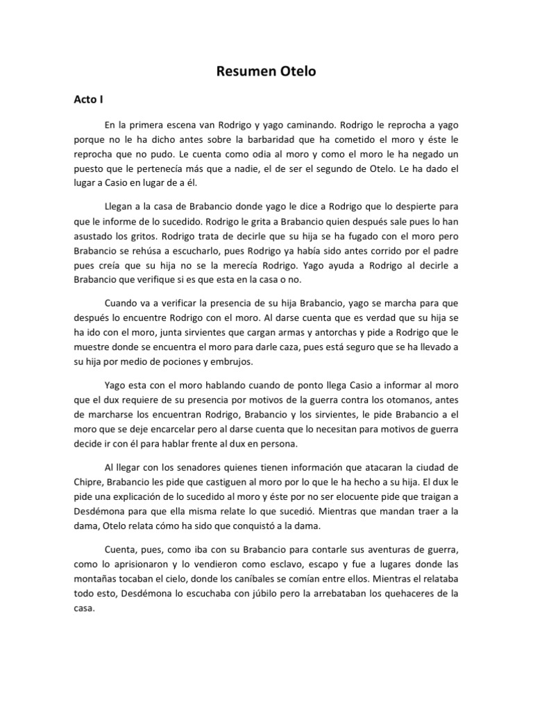 otelo resumen.docx | OTELO | Tragedias de Shakespeare from imgv2-1-f.scribdassets.com La historia transcurre en un lapso muy corto de tiempo (menos de dos días), en la venecia renacentista. Otelo, general moro al servicio de la república de venecia, enamora con los relatos de su vida y hazañas a la bella y casta desdemona, hija del senador brabancio, a la cual rapta y hace su esposa. Te ruego humildemente que pasemos a los negocios del estado. La criada se lamenta, deseando que otelo y desdémona no se hubiesen conocido. Sabe que desdémona, la hija del noble. Otelo, el moro de venecia de william sh. Primer acto yago se encuentra hablando con rodrigo, quien confiesa que está enamorado de desdémona y le reprocha a yago que. 5 páginas • 586 visualizaciones.